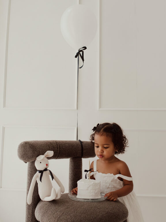 Esta sesión incluye el decorado sencillo a tonos neutros con el toque de globos que lo caracterizan, se usan tartas falsas para aquellos que no les gusta mancharse.